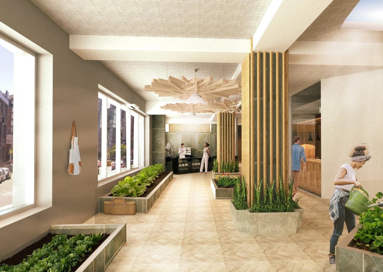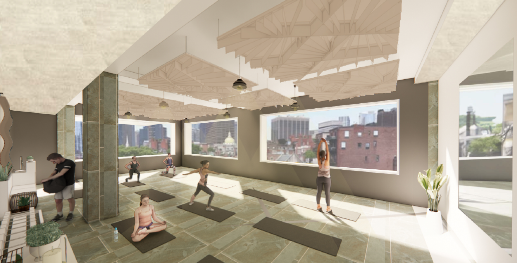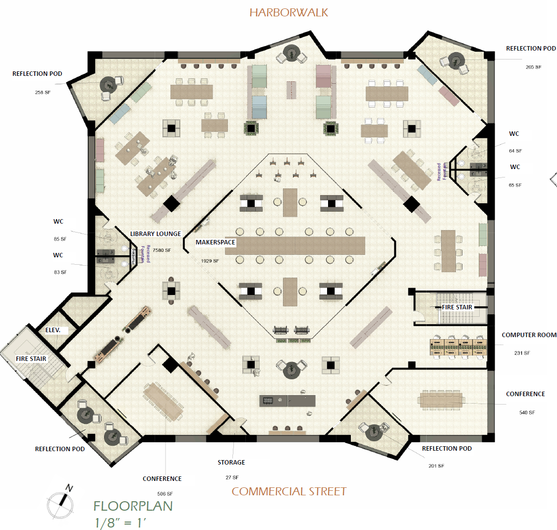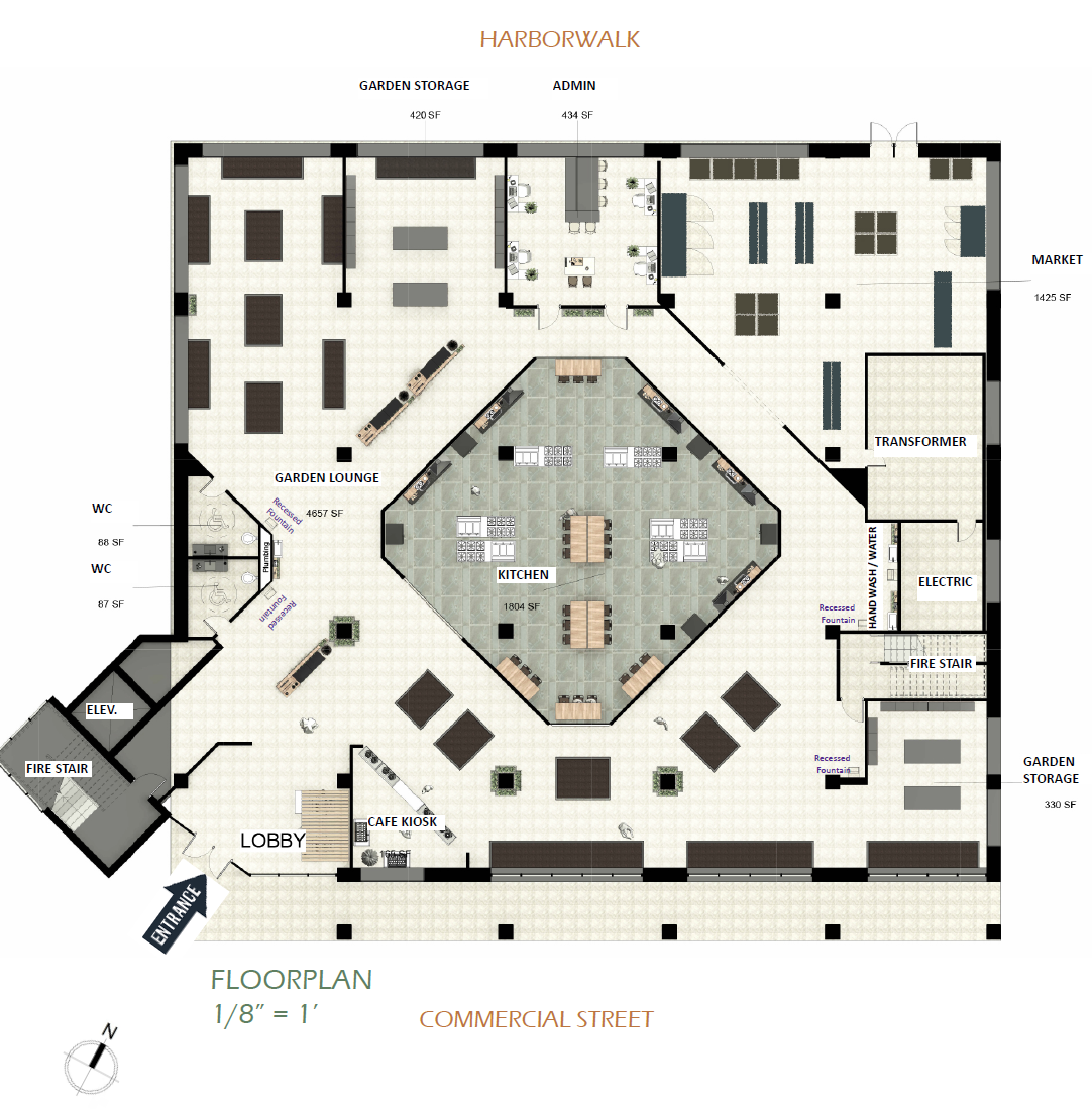 I created a plan for a wellness center proposed at 585 Commercial Street in Boston’s North End. With a focus on self and community productivity, the center features garden plots, a community kitchen, a co-working library, fitness studios, and a communal pool.
